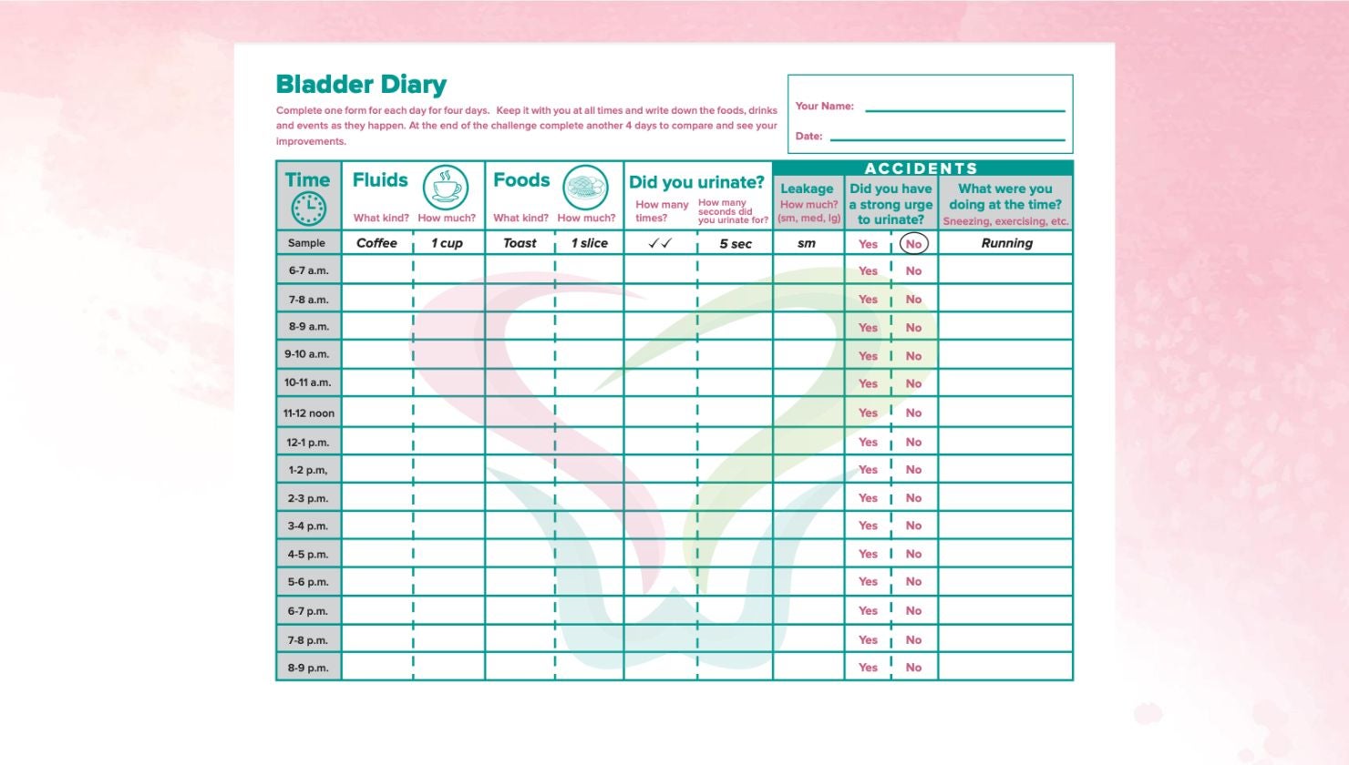 We want to track your progress. We'll start by outlining how many times you use the bathroom, and how many times you leak unexpectedly or have urgency.
